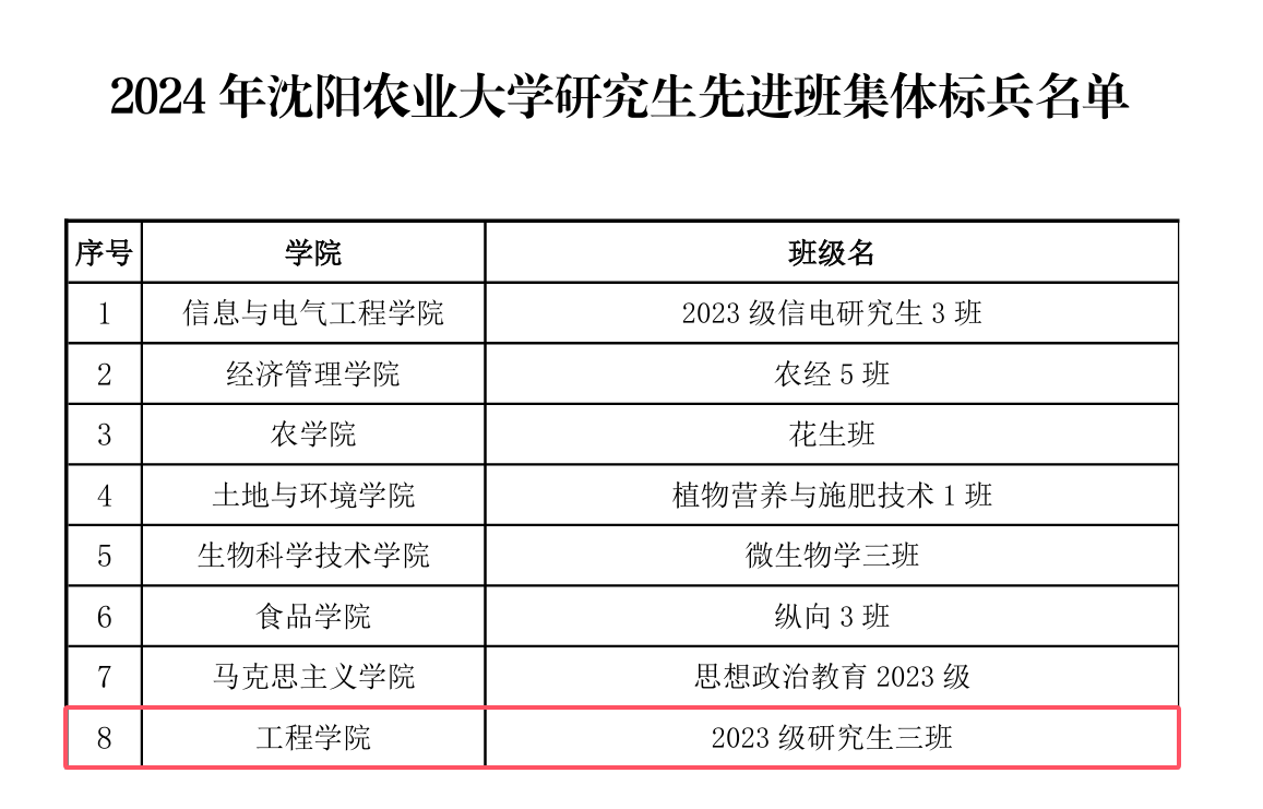 近日,研究生院(党委研究生工作部)公布2024年沈阳农业大学研究生先进班集体及标兵名单。根据《关于做好2023-2024学年度研究生评优表彰工作通知》,经班级申请,学院初评、推荐,学校评审,我院2023级研究生三班荣获2024年沈阳农业大学研究生先进班集体标兵。(星空平台 董瀚辰)