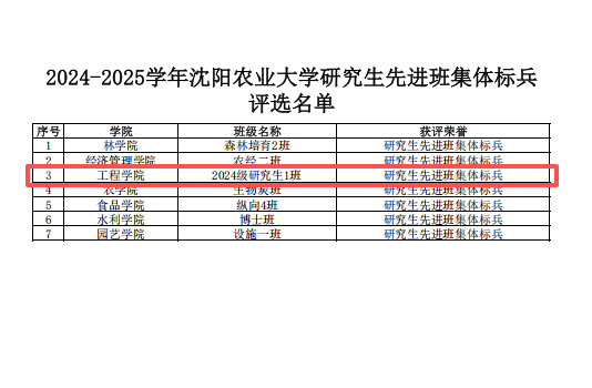 近日,学生处公布2024-2025学年沈阳农业大学研究生先进班集体及标兵评选结果。根据《关于做好2024-2025学年度研究生评优表彰工作通知》,经班级申请,学院初评、推荐,学校评审,我院2024级研究生1班荣获2024-2025学年年沈阳农业大学研究生先进班集体标兵。(星空平台 董瀚辰)
