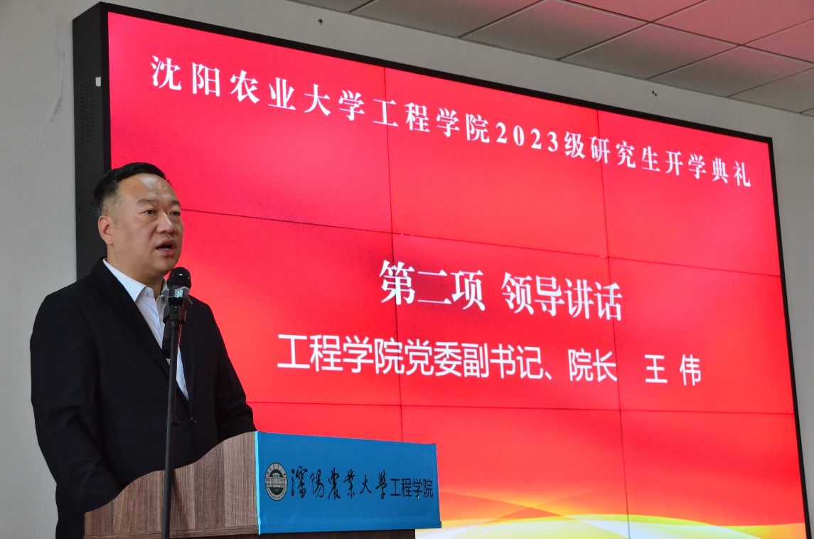 院长王伟发表讲话,代表学院向2023级研究生新同学表示欢迎和祝贺,并要求同学们尽快进入研究生阶段,不要仅仅停留在书本上的知识,而是要善于思考与研究,把握研究生期间进入工厂学习的机会,投身到田间地头,进行相关试验,学会总结归纳并做好科研记录。最后,王伟院长勉励新同学要厚植家国情怀,牢记强农兴农使命,让青春在全面建设社会主义现代化国家的火热实践中绽放绚丽之花。